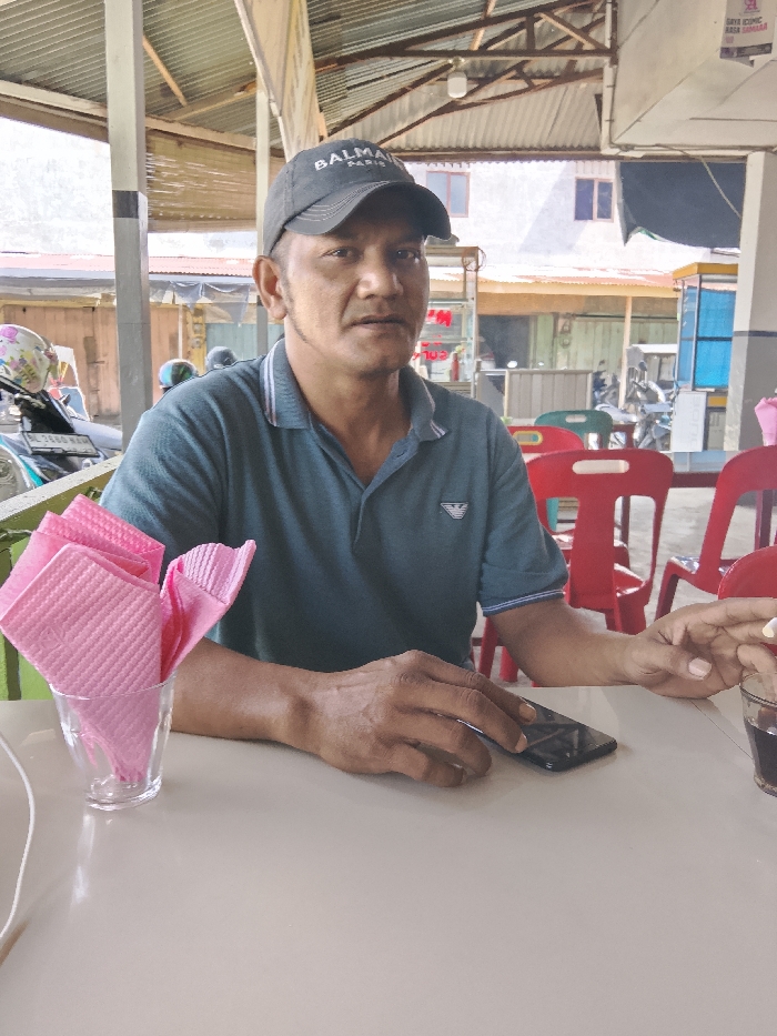An adult male with dark complexion and short hair is seated upright at a light-colored tabletop in an open-air eatery in Lhokseumawe, Indonesia