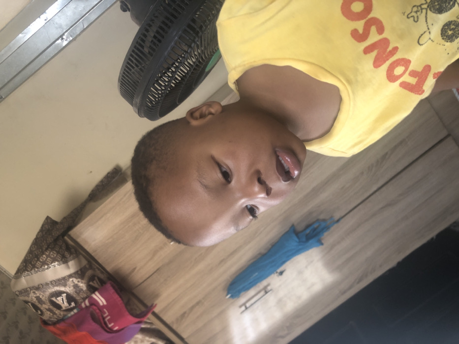 A child with short hair wears a yellow "FONSO" shirt, lying on a wooden surface