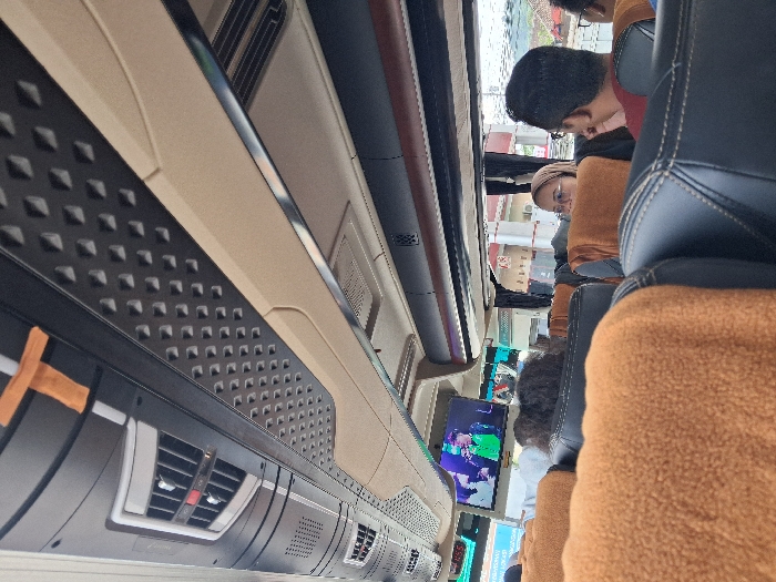 Inside a bus, passengers sit in leather seats, some covered with brown blankets. One passenger wears a tan head covering and glasses. A television mounted on the ceiling displays an image. The bus's interior features textured black panels with patterned indentations. Air conditioning vents are visible above the passenger seats. A luggage rack with a silver rail runs along the bus ceiling. The image is rotated slightly counter-clockwise.
