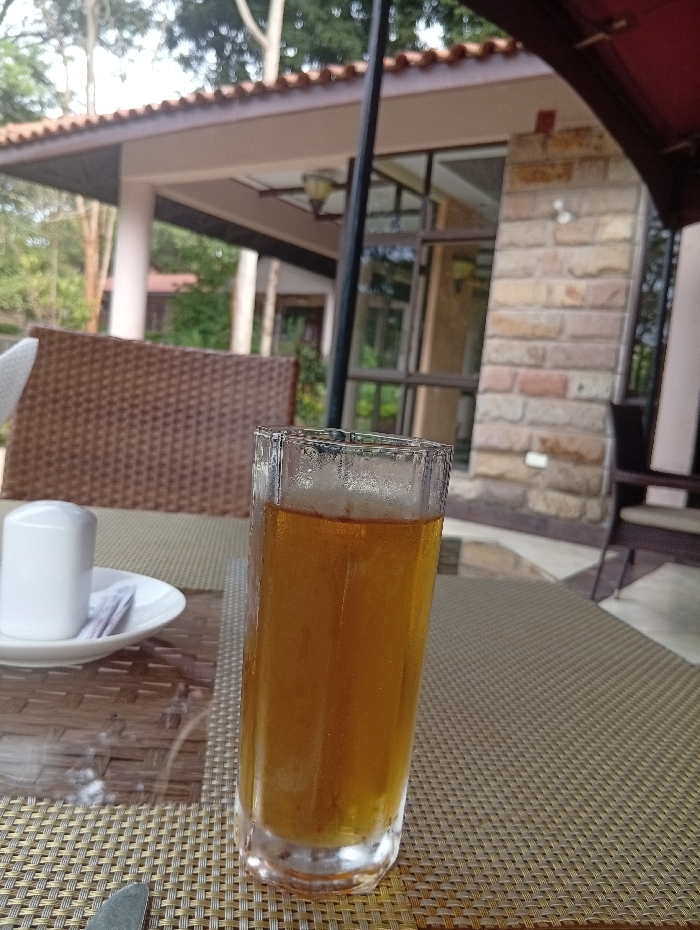 A tall glass of amber-colored liquid sits on a woven table. A white condiment container and small plate holding sticks are nearby. In the background, a wicker chair faces a brick building with large glass windows and a terracotta roof. The scene appears to be an outdoor dining area at a resort or restaurant.