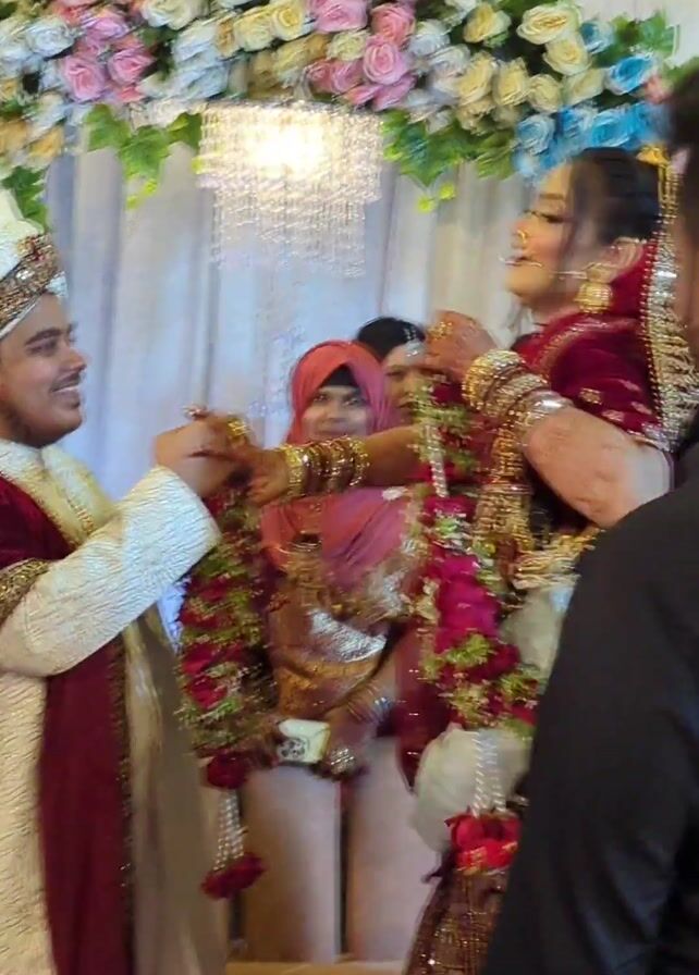 wedding ceremony. The groom, wearing a white and maroon outfit and a traditional hat, is standing and smiling as he lifts the bride, who is wearing a maroon and gold sari and jewelry. People are around them, some are cheering and taking pictures with their phones. The background is decorated with flowers and a chandelier.