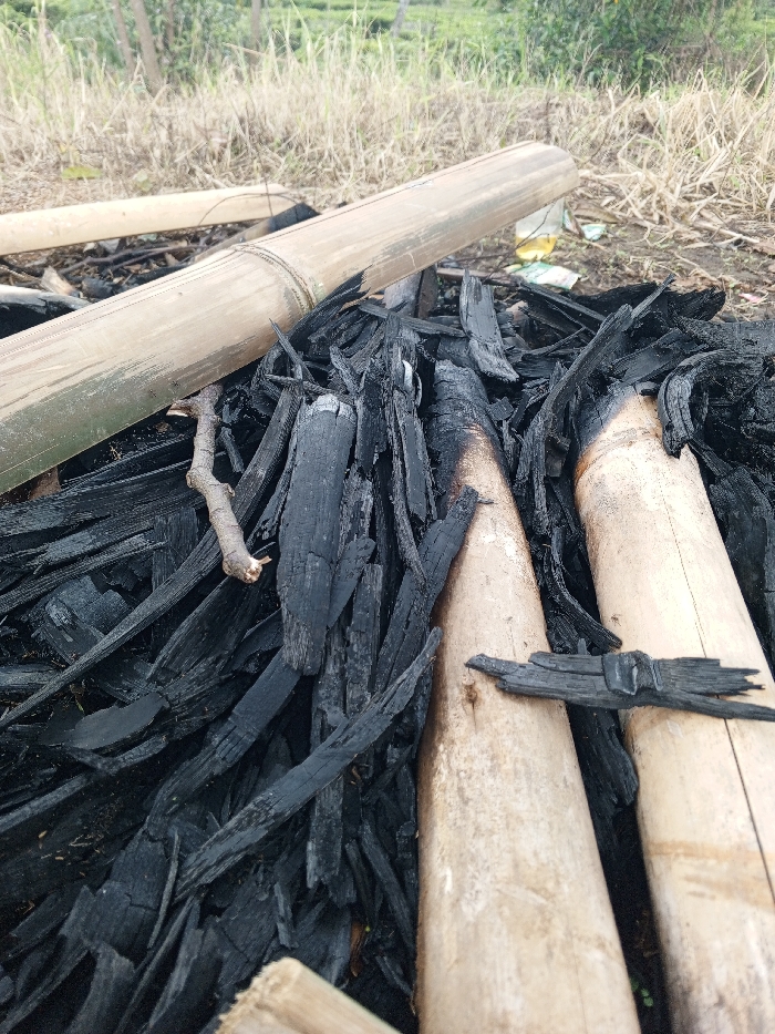 The image displays an outdoor scene in Ciherang, Indonesia, featuring a pile of charcoal and bamboo