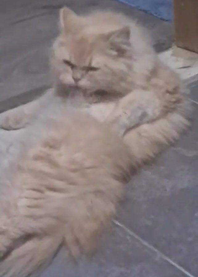 A fluffy, light-orange Persian cat lies on a gray tiled floor
