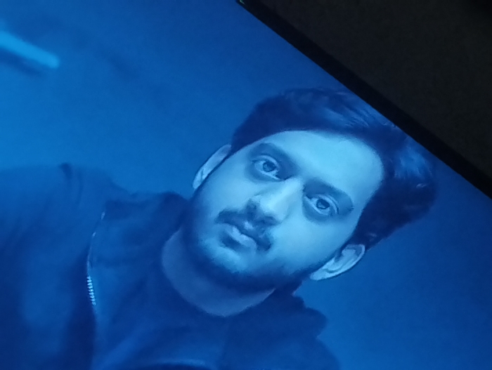 A close-up image displays an adult male, approximately 20-35 years of age, from the mid-chest upward. He possesses dark, neatly styled hair, a short beard, and a mustache. His eyes are dark and directed towards the viewer, with a neutral facial expression. He wears a dark-colored, presumably zippered, garment, with a metal zipper pull visible on the left side of his chest. The background is a uniform dark blue, with a subtle lighter blue horizontal streak observed in the upper left quadrant. The entire scene is rendered with a strong blue color cast. A dark bezel, characteristic of a display screen, is partially visible along the top right edge, indicating the image source. The depicted scene is set within the city of Kuchingoro, Nigeria.