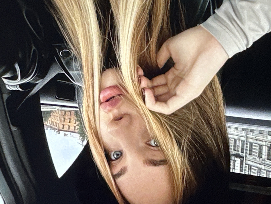 The image displays a close-up, rotated view (approximately 90 degrees counter-clockwise) focused on a person's face and upper torso from within a vehicle. The subject, identifiable as a female by facial features and long blonde hair, has pale skin, prominent blue eyes, and dark eyebrows. Her mouth is slightly open, revealing pink-toned lips and a portion of the tongue. Long, straight blonde hair flows diagonally across the frame. A slender left hand, with dark nail polish on the fingernails, is positioned near the subject's right cheek, appearing to grasp strands of hair. The visible forearm is covered by a light grey long-sleeved garment, while a dark, possibly leather, jacket is visible on the upper body. Dark interior elements of the vehicle, including what resembles a seatbelt component on the upper right, frame the view. Through an opening, likely a window or sunroof, an urban building is visible in the background. This building is multi-storied, featuring a light-colored facade with numerous rectangular windows, along with visible green foliage. No specific identifying markers or landmarks are present in the image to confirm its location in Novosergievka, Russia.