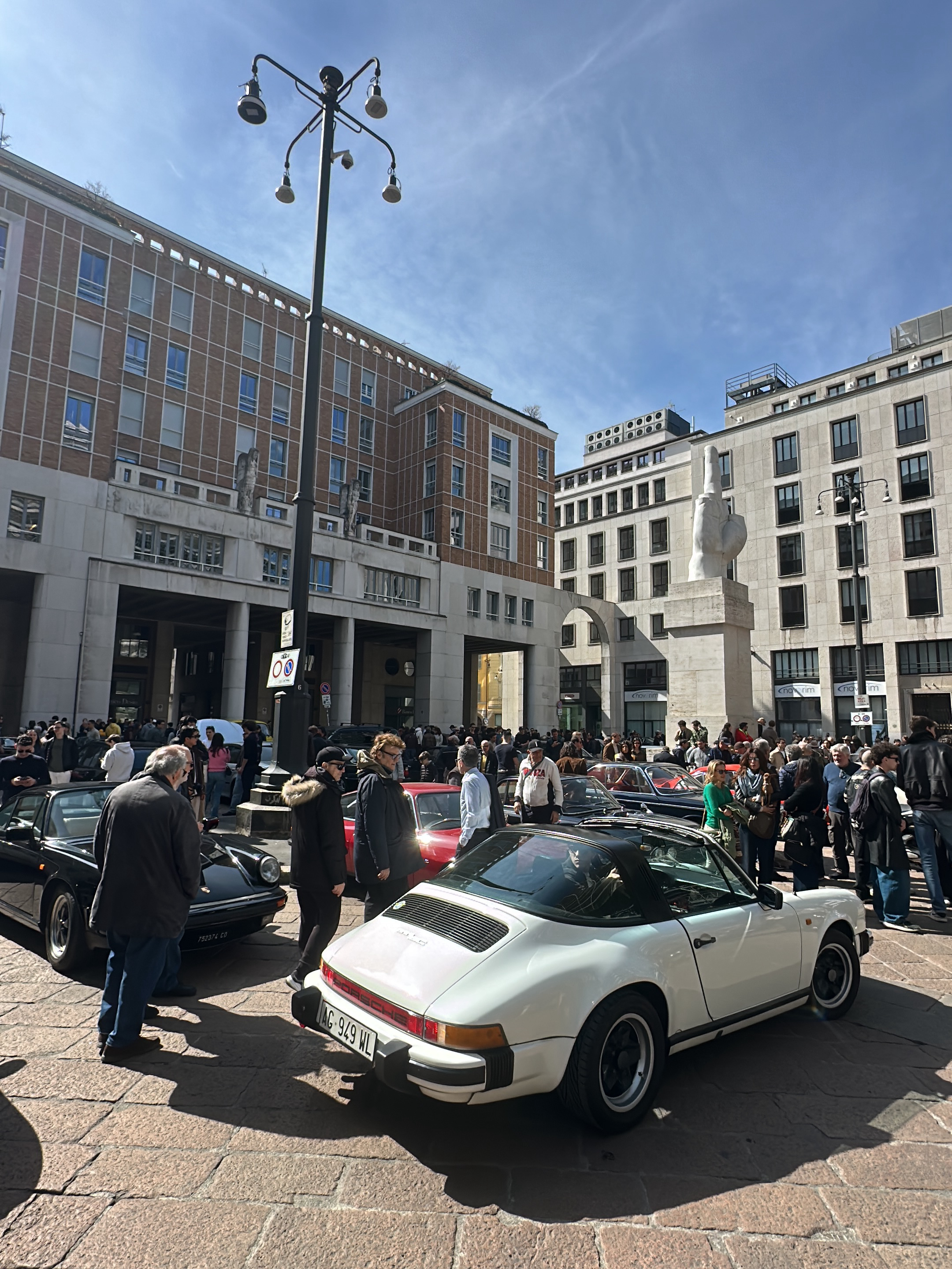 gathering in Piazza Affari, Milan, Italy, with numerous people present. The plaza is paved with light-colored blocks. Several vintage cars are displayed, including a white Porsche Targa in the foreground and a black car to the left, attracting the attention of the onlookers. In the background, the Italian Stock Exchange building stands prominently, and a large sculpture of a hand with a raised middle finger is visible in the center. The sky is blue with scattered clouds. The people are dressed in casual clothing, indicative of a daytime event.