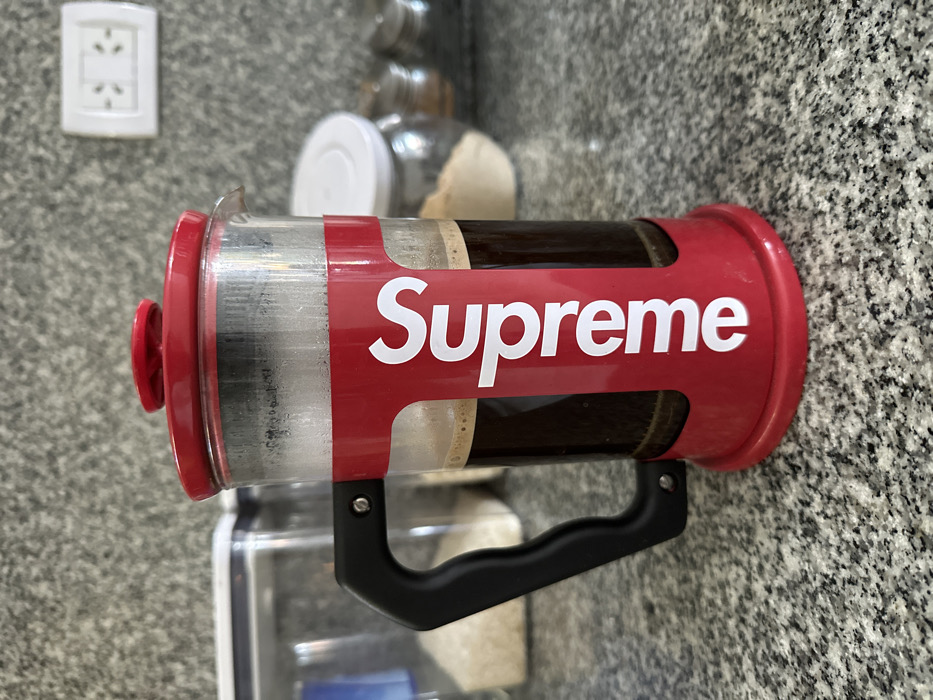 A red and clear glass French press, featuring a vertical white "Supreme" logo on its red frame, is centrally positioned on a speckled grey granite countertop