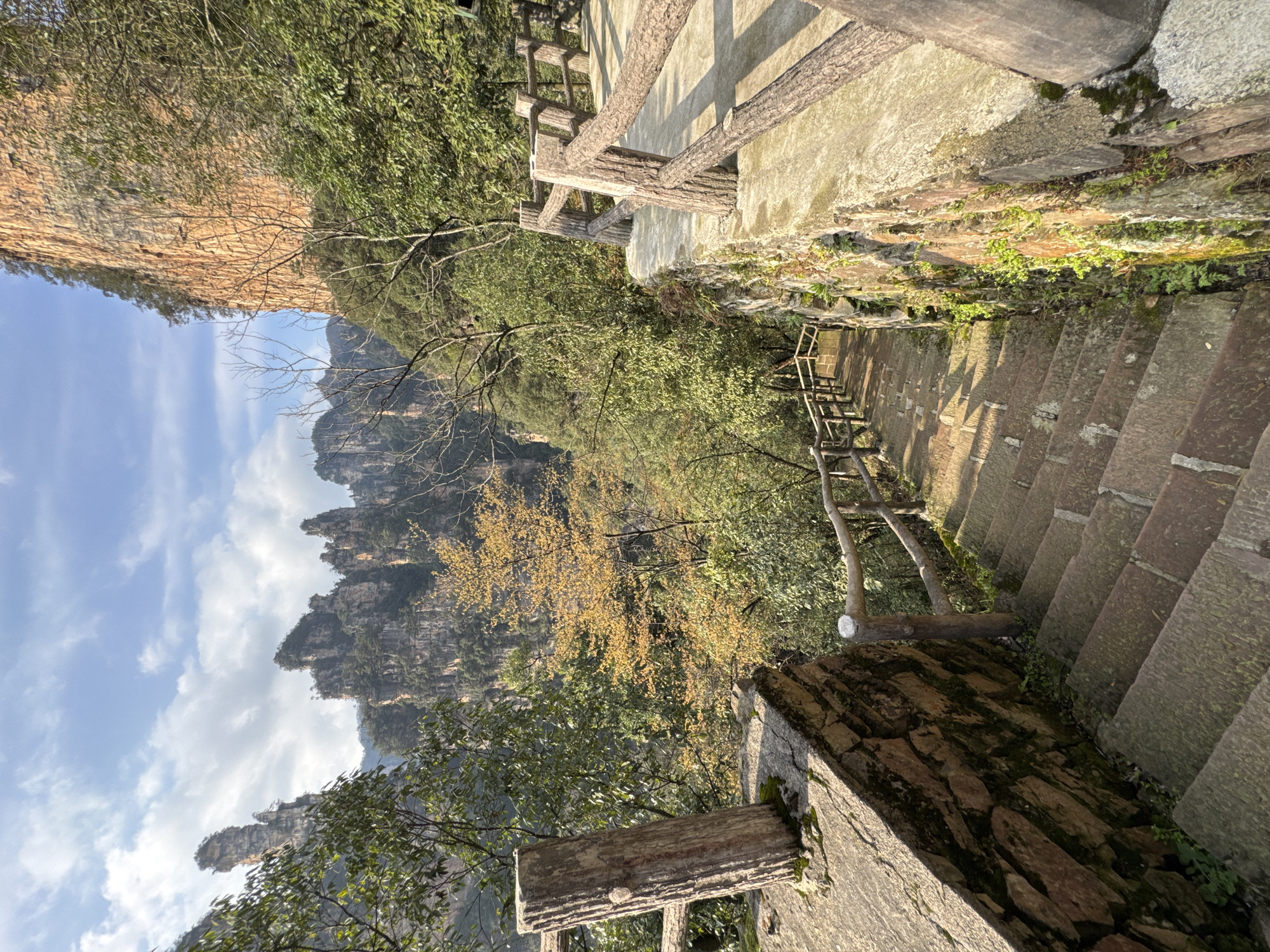 The image displays a descending outdoor stone staircase and pathway located within the mountainous landscape of Wulingyuan, China. No individuals are present. The scene is dominated by natural rock formations and dense vegetation under a partly cloudy blue sky. In the foreground, a concrete and stone pathway is visible, equipped with a rustic railing system constructed from materials designed to mimic natural logs. On the left, a stone retaining wall, partially covered in moss and small green plants, borders a series of worn stone steps that descend into the lower portion of the frame. On the right, a wider concrete path with a similar log-style railing extends horizontally before also transitioning into descending stone steps. The midground and background feature dense forestation, including numerous green-leafed trees and one prominent deciduous tree with bright yellow foliage, suggesting an autumn season. Beyond the immediate path, towering sandstone pillars, characteristic of the Wulingyuan geological formations, rise steeply against the sky. These pillars exhibit varying shades of grey and brown, with some vegetation clinging to their sides. The sky is bright blue with scattered white cumulus clouds, and direct sunlight illuminates the scene, casting defined shadows on the pathway and foliage.