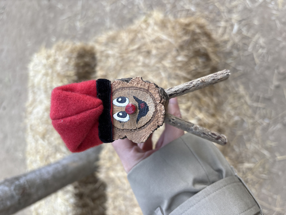 The scene is set outdoors in Castellar del Vallès, Spain. A handcrafted Tió de Nadal figure is the central subject, approximately 15 cm in height. It features a wood slice as its body with a painted face: white eyes, black pupils, a prominent red nose, and a black smiling mouth. A red felt barretina, traditional Catalan hat, with a black band sits atop the figure. Two slender wooden sticks serve as legs. A human hand, clad in a light beige or khaki long-sleeved garment, is visible on the left, holding the Tió de Nadal from behind. The blurred background contains multiple light-brown rectangular hay bales arranged on the ground and a tree trunk partially visible on the far left, suggesting an agricultural or rustic environment.