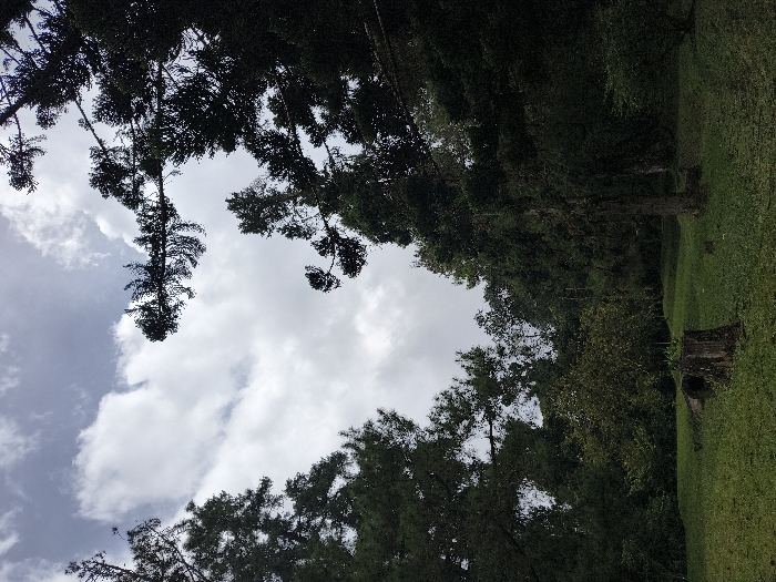 A sky filled with white, fluffy clouds is framed by dark green trees. The tree branches extend inward from the top and bottom of the image, partially obscuring the sky. On the right, a grassy area leads up to a tree trunk. The angle of the photo is tilted.