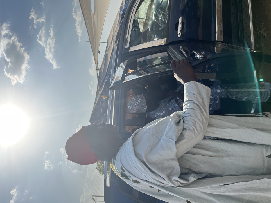 The scene depicts a sunny outdoor environment in Ajikemai, Nigeria. In the foreground, a dark-skinned individual, likely male, is partially silhouetted against a bright sky, facing right in profile. He wears a red cap and a light-colored, patterned traditional garment, possibly a agbada or similar attire. His right hand grasps the open rear passenger door of a dark-colored SUV, which appears to be a Toyota Highlander. Inside the vehicle, another person is visible, wearing a patterned white and black head covering. The open car door reveals part of the interior, including the seat and trim. In the background, white and blue tarps or awnings are visible, stretched over structures, suggesting a temporary gathering or market setting. The sky is bright with a prominent sun flare in the upper left, indicating direct sunlight, and scattered white clouds are present. The ground appears to be dirt or unpaved.