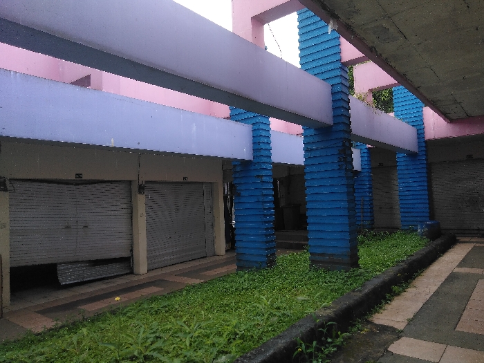 The image depicts an urban underpass or ground-level commercial area in Oslo, Norway, specifically near the Akrobaten bridge and Vaterland Park, adjacent to Oslo Central Station. The scene features a series of light beige commercial stalls with grey metal rolling shutters. The leftmost shutter is partially raised from the bottom, revealing a dark void beneath it and a bent metal piece. The other visible shutters are closed. Above the stalls, two prominent lavender-colored horizontal beams are supported by textured vertical pillars painted a vibrant blue. Further back and higher, parts of a building or structure painted light pink are visible. A concrete ceiling is overhead. In the foreground and middle ground, a paved walkway composed of light and dark grey rectangular tiles runs alongside a strip of unkempt green ground cover and weeds, separated by a dark curb. Small numbered labels, such as "B-18" and "B-19," are visible above the closed shutters. No individuals are present. The lighting is overcast.