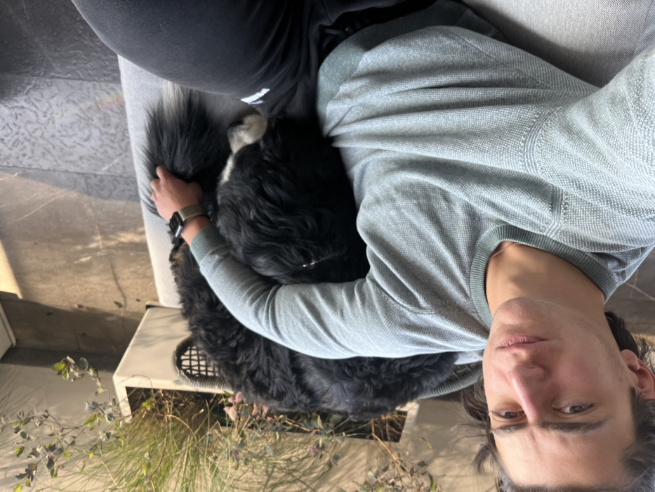 The image, captured from an elevated perspective and rotated approximately 90 degrees clockwise, depicts an individual and a canine resting on a light gray upholstered lounge. The scene is set in an outdoor or semi-outdoor environment within Santiago Yancuitlalpan, Mexico. The individual, identified as an adult male with dark, wavy hair, is observed in a reclined position, wearing a light greenish-gray long-sleeved sweater and dark trousers. A smartwatch with a tan-colored band is present on his left wrist. His gaze is directed towards the camera, maintaining a neutral facial expression. A large, long-haired dog, consistent with a Bernese Mountain Dog or similar breed, exhibiting predominantly black fur with distinct white markings on its chest and snout, is positioned across the individual's chest and lap. The dog appears to be in a state of rest. The individual's left arm is bent, resting upon the dog's back, with the hand in proximity to the dog's tail. The background includes a white rectangular planter containing various green plants, some displaying slender stems and small leaves, others appearing as grasses. A dark-colored tiled surface is visible in the background and beneath the lounge. The area is illuminated by natural light, suggesting an exterior or brightly lit transitional space.