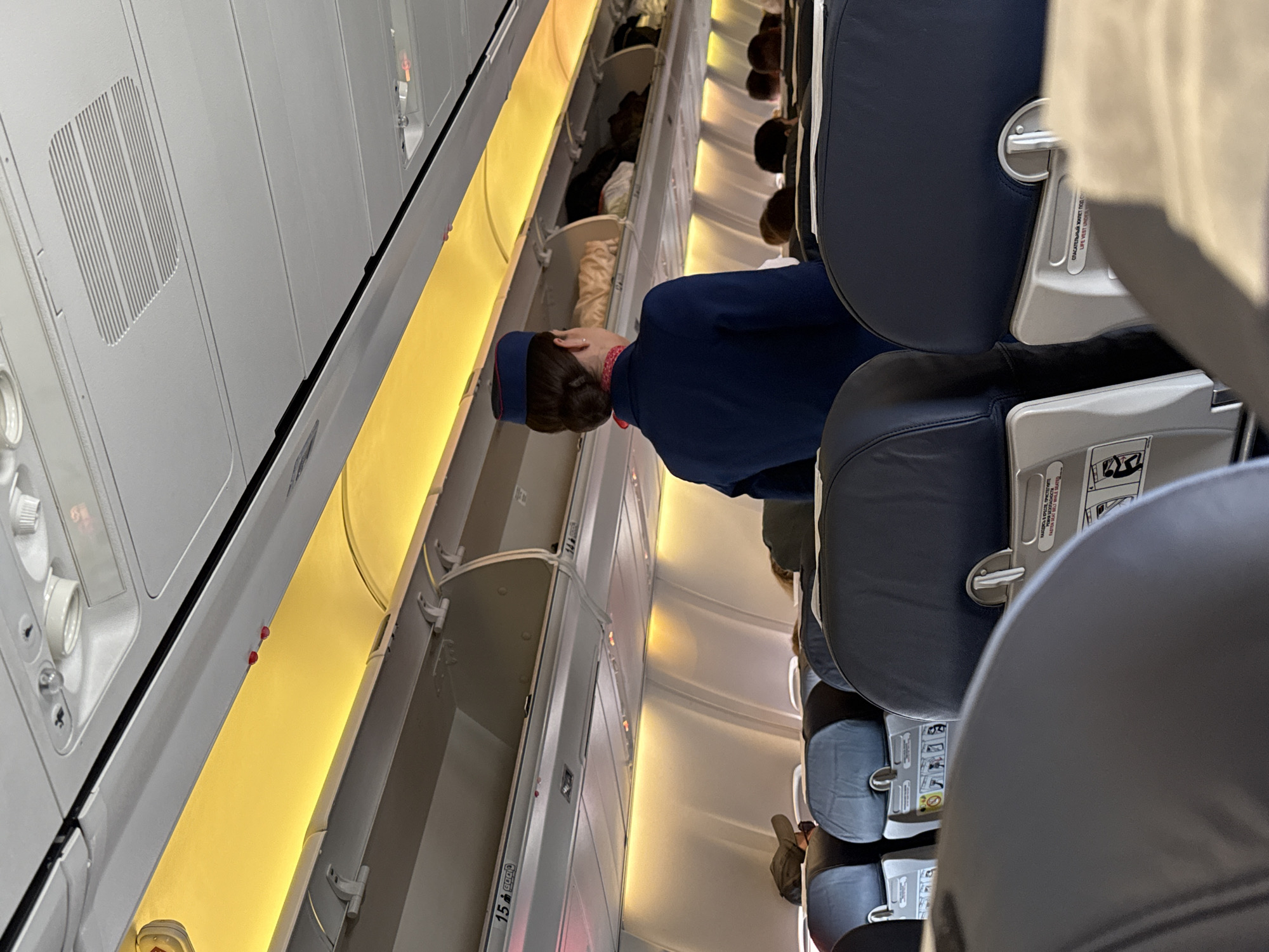 The image depicts the interior of an airplane. A flight attendant, wearing a navy blue uniform and a matching hat, is visible in the aisle. The overhead compartments are partially open, revealing passengers' luggage. The seats are upholstered in blue. Other passengers are seated. Labels with row numbers and emergency exit instructions are visible on the walls. The lighting is bright and warm. The location cannot be determined from the image.