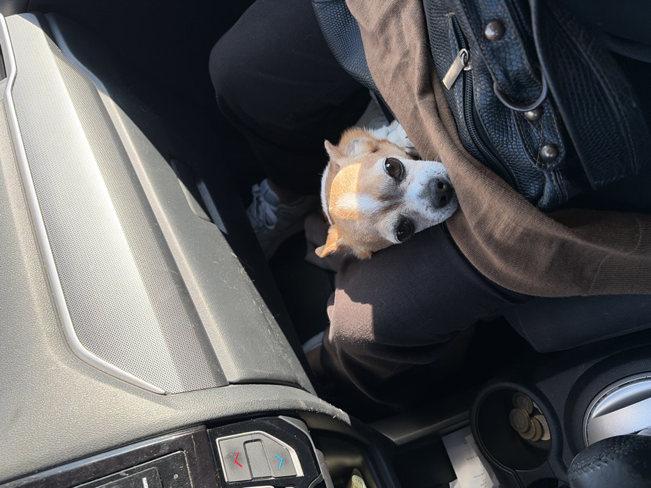 A small, brown and white chihuahua-like dog rests its head on a person's lap inside a car. The person is wearing dark pants and has a black purse slung across their body. The car's dashboard and console are visible, with buttons and a cup holder containing coins. The dog gazes towards the camera with large, dark eyes.