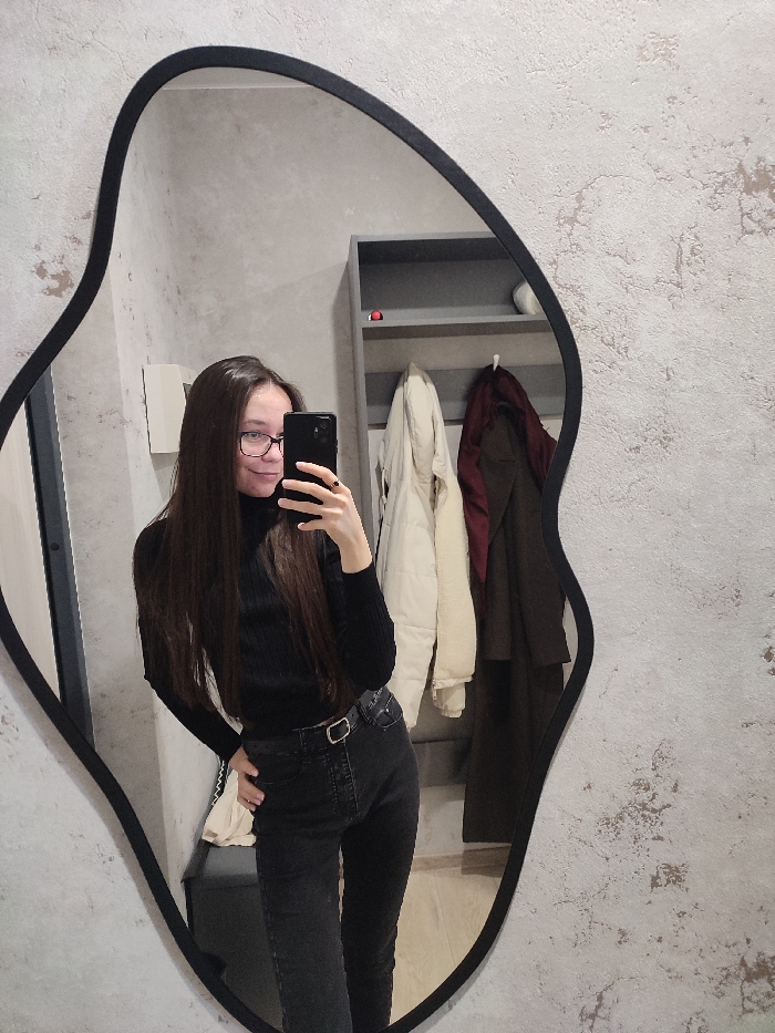 The image displays an interior scene, likely within a residence in Izhevsk, Russia, though the specific location within the city is not visually discernible. The primary subject is a young adult female, visible in reflection within a large, irregularly shaped mirror with a thin black frame. The female has long, straight, dark brown hair and wears dark-framed eyeglasses. She is dressed in a black long-sleeved ribbed turtleneck top and dark grey jeans with a dark belt featuring a light-colored buckle. A ring with a dark stone is present on her left ring finger. She holds a black smartphone in her right hand, positioned to capture her reflection, and is smiling faintly while looking towards the phone. Her left hand rests on her hip or in her pocket. Reflected in the mirror, behind the subject, is a section of a room. To the viewer's right (subject's left), a light-colored, possibly white or cream, puffy jacket hangs on a hook. To the viewer's left (subject's right), a dark red/burgundy coat and a dark brown/olive coat hang on separate hooks. Above these coats, a multi-tiered grey shelving unit is visible, containing minimal items, including a small red object and a white object on different shelves. A light-colored floor is visible at the bottom of the reflection, and a dark vertical element, possibly a door frame or furniture, is partially reflected on the far left. The wall outside the mirror's frame exhibits a light grey, textured finish, resembling stucco or concrete. The lighting in the scene appears uniform, with no harsh shadows.