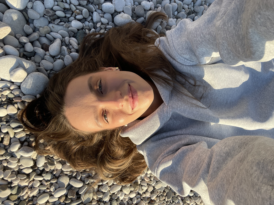 A single female individual is depicted lying supine on a pebbled surface in Drobnići, Montenegro. She is positioned with her head towards the top of the frame, looking directly into the camera with a slight smile. Her long, wavy brown hair is spread out around her head, resting on the pebbles. She is wearing a light grey hooded sweatshirt. Sunlight illuminates her face from the viewer's left, highlighting her right cheek and casting soft shadows on her left cheek and under her chin. The ground beneath her is uniformly covered with numerous rounded pebbles of varying sizes and shades of light grey, white, and tan.