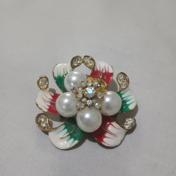 A flower-shaped brooch sits on a gray surface. The brooch features enameled petals, colored red, white, and green. Each petal is bordered in gold with small rhinestones. Faux pearls form the flower's center, surrounded by more sparkling rhinestones in a gold-toned setting.