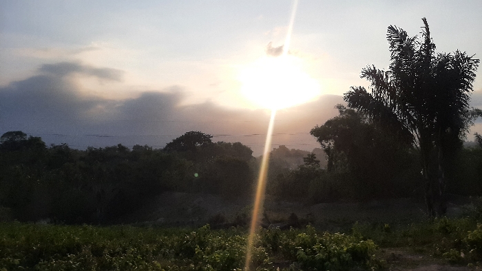 The image depicts a natural landscape scene in Lhokseumawe, Indonesia, captured during either sunrise or sunset. The sky, occupying the upper third, is a pale blue-grey with diffuse clouds. A brilliant sun, positioned centrally in the upper portion, emits a strong vertical lens flare that extends downwards through the frame. Below the sky, a distant body of water, appearing dark and calm, is visible across the horizon. The midground is dominated by a dense, dark mass of tropical foliage and trees, largely silhouetted, forming an undulating line above the foreground. A prominent, dark, palm-like tree with distinct fronds stands on the far right, silhouetted against the sky. The immediate foreground features lighter green, low-growing vegetation, possibly scrubland or cultivated plants. Faint indications of disturbed earth or a narrow dirt path are present on the right side of the foreground. No human figures, animals, or identifiable man-made structures are visible within the frame.