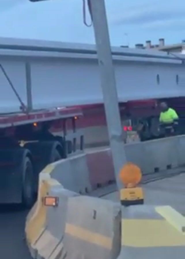 A large truck is transporting a wide, white beam through a street construction zone. The truck, pulling a flatbed trailer, is white with a red cab and displays the name "Despalles." The beam extends beyond the trailer's width, requiring careful maneuvering around concrete barriers painted with yellow stripes. A construction worker in a high-visibility yellow vest stands near the truck, guiding its movement. A triangular yield sign with a "100 m" distance indicator is visible in the foreground. The sky suggests it is either early morning or late evening. The construction zone is marked with orange warning lights and traffic control measures.