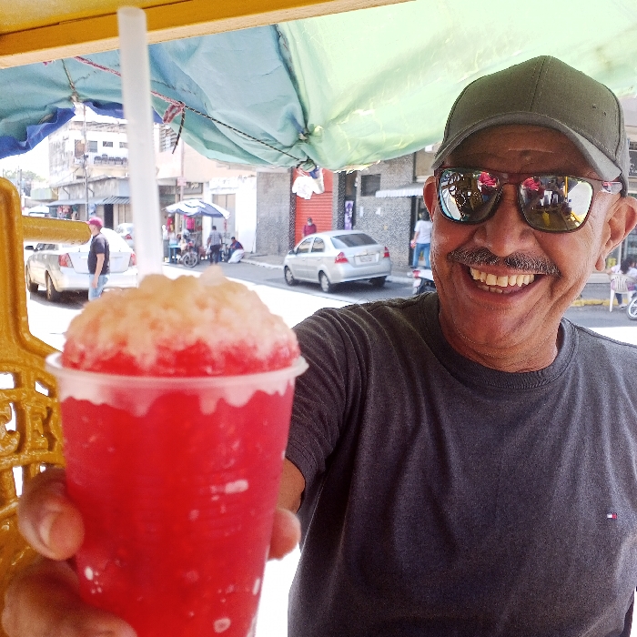 A smiling man with a mustache, cap, and reflective sunglasses holds a red shaved ice drink with a straw