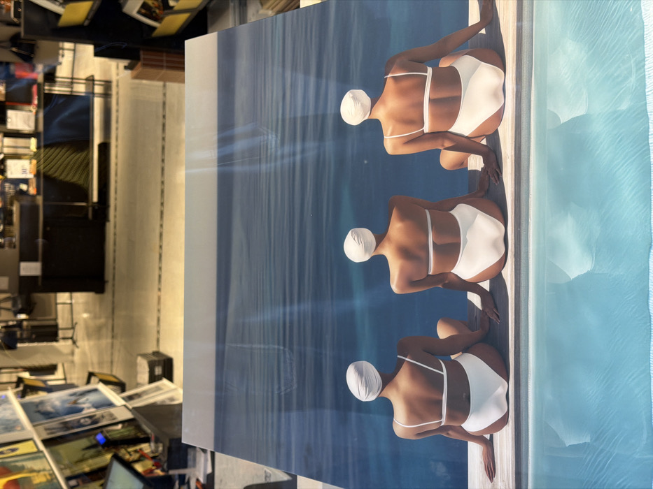 A large, rectangular artwork, depicting three figures seated at the edge of a body of water, is displayed within an indoor commercial space in Paris, France. The print shows three individuals from behind, each wearing a white two-piece swimsuit and a white swimming cap. They are positioned horizontally on what appears to be a light-colored wooden deck, looking toward an expanse of blue water. The water immediately adjacent to the figures is a light blue, indicative of a swimming pool, while further out, the water is a deeper blue with subtle surface reflections and a faint horizon line against a lighter sky. Reflections of overhead lighting are visible on the artwork's glossy surface. The surrounding environment consists of metal shelves displaying other framed prints or books to the left and right, a dark counter or desk in the blurred background, and a light-colored, patterned floor. The setting is consistent with an art gallery or a dedicated art section within a larger retail establishment.