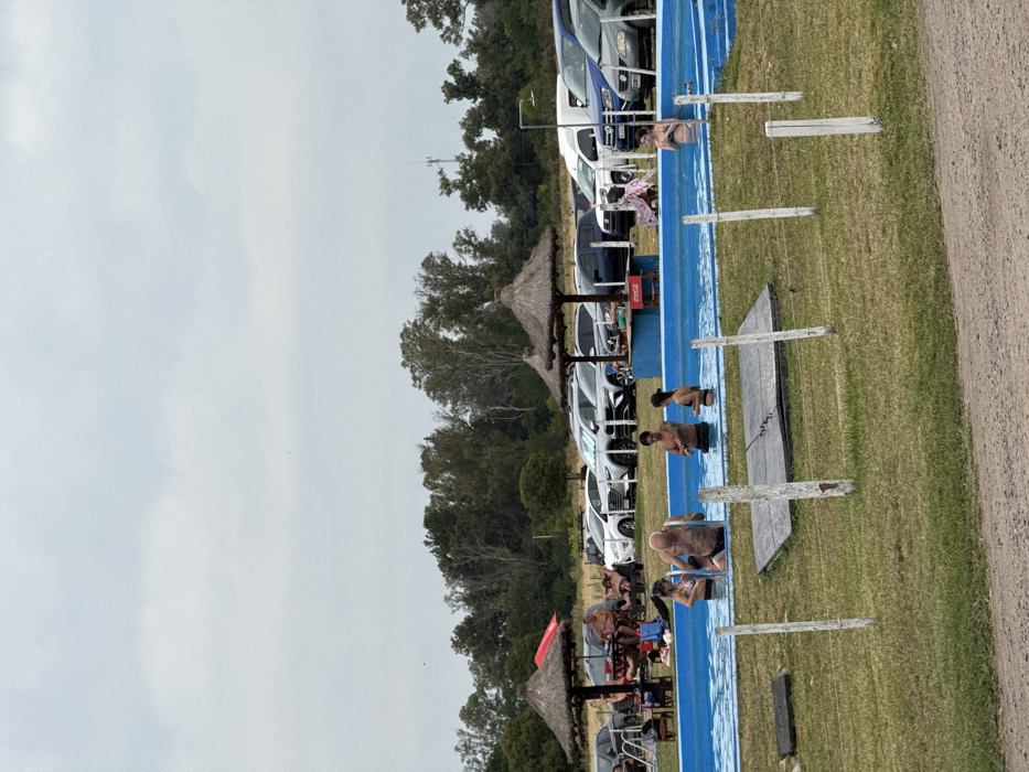 A waterside scene shows people enjoying a long, narrow, blue pool. Some people are in the water, while others lounge on the grass alongside it. Several thatched umbrellas offer shade, and a row of parked cars lines the edge of the area. The sky is overcast, suggesting a cloudy day. The scene exudes a relaxed, recreational atmosphere.