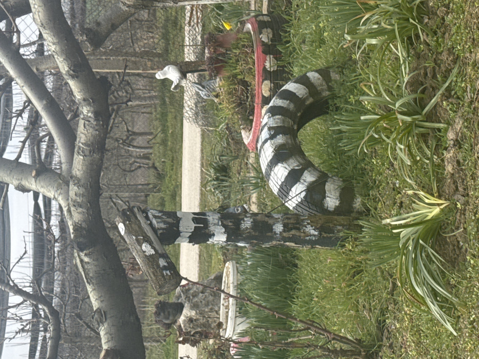 The scene, located in Polkovnik Lambrinovo, Bulgaria, depicts a garden or yard with various decorative elements and vegetation under a muted, possibly overcast sky. In the foreground, green grass and emerging ground cover extend across the lower half of the frame. A large, bare tree branch horizontally traverses the upper portion of the image. Centrally positioned, a vertical wooden post or tree stump is painted with irregular black and white stripes; white paint drips downward from a section. A smaller, horizontally oriented log, also with white paint, is affixed to the top of this striped post. To the immediate right, a section of a tire, painted with black and white stripes, forms an arch partially embedded in the ground. Further right and behind the tire arch, a red-painted tire serves as a planter, containing green foliage and a single yellow daffodil-like flower. A white bird figurine is perched on a vertical element within this red planter. To the left of the striped post, a white bucket or container is partially visible near a stone sculpture featuring a dark, sculpted head. In the midground, a light-colored dirt path or road stretches horizontally. Beyond the path, various deciduous trees and bushes, some bare and some with nascent green foliage, are visible. The background reveals an agricultural structure covered by a dark netting system, under a light, cloudy sky.