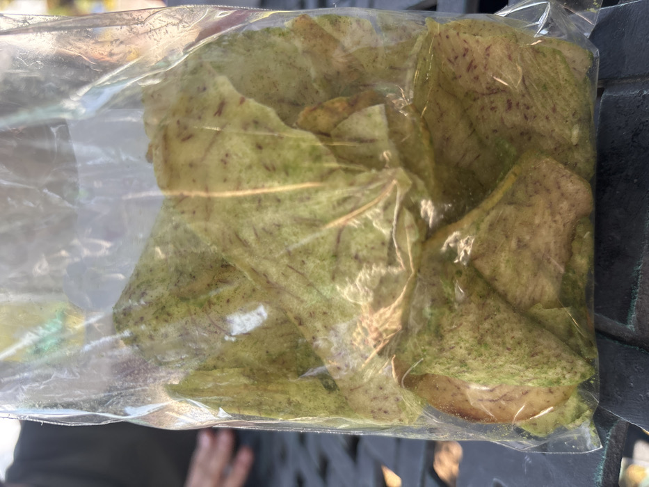 A sealed plastic bag contains an assortment of chips, appearing greenish-brown with dark specks and lines. The chips are irregularly shaped, and some have visible browning on the edges. The bag is partially obscured by reflections, and a hand is visible at the bottom left corner. Part of a dark surface can be seen to the right of the bag.