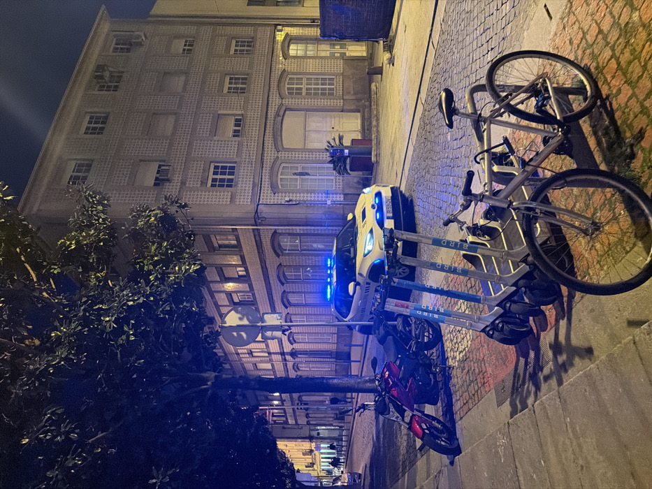 A nighttime urban street scene in Braga, Portugal, features a white Toyota Yaris Cross police SUV (license plate 81-SS-0V) parked on a cobblestone street with its blue emergency lights active. The vehicle is angled towards the right, facing away from the camera. To the left, a red motorcycle is parked on the sidewalk. In the immediate foreground, three "Bird" brand electric scooters are aligned on the sidewalk, positioned next to a bicycle rack where a silver bicycle is secured. The street is paved with cobblestones, and the sidewalk consists of large rectangular paving slabs. A large tree with dark foliage is on the left, partially obscuring background buildings. On the right, a multi-story building with a facade covered in patterned *azulejos* (Portuguese tiles) is prominent, featuring multiple windows with varying states of shutters. Several indistinct pedestrians are visible walking in the distance on the left side of the street. The scene is illuminated by artificial street lighting and the blue lights from the police vehicle.