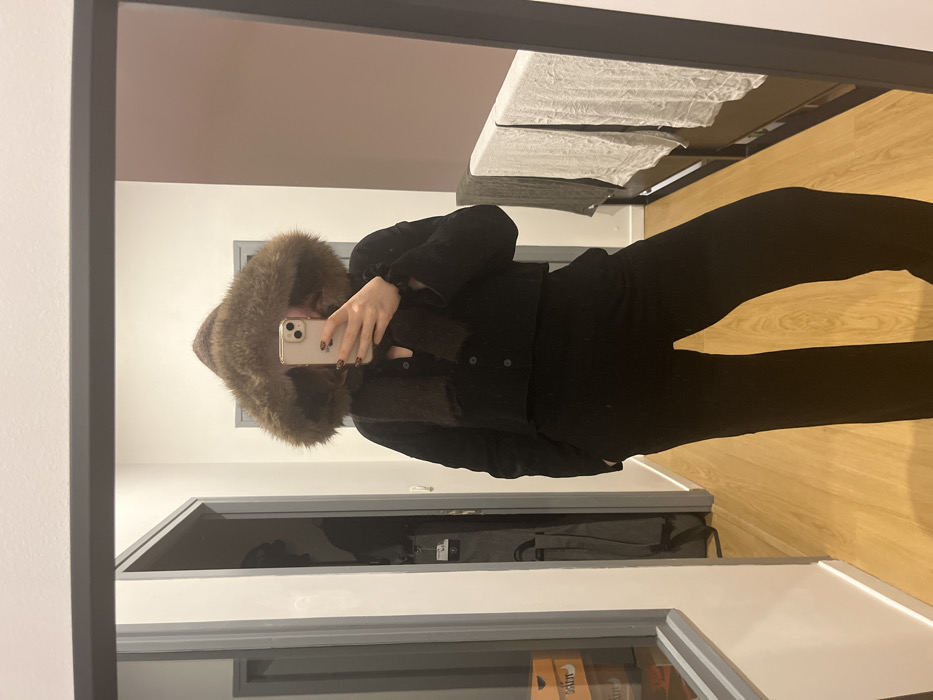 An individual is depicted in a full-length mirror selfie, taken indoors. The location within Roubaix, France is not identifiable from the visual content of the image. **Subject:** A person is centered in the frame, obscuring their face with a light-colored smartphone held in their right hand, pointed towards the mirror. The individual wears a dark brown, possibly faux fur, hooded garment with the hood up, framing the phone. A dark brown scarf-like item is draped around the neck. The main attire consists of a black, long-sleeved, cropped button-down top and black, wide-leg trousers. A black scrunchie is visible on the left wrist, and fingernails display a patterned design. The individual's left hand is placed in a pocket or rests at their side. **Environment (Reflected):** * **Foreground:** The mirror features a dark grey or black frame. The immediate wall where the mirror is mounted is white. The floor is a light wood laminate throughout the visible space. * **Background (left reflection):** A doorway with grey trim leads to another room. Visible inside this room are a dark-colored backpack or bag hanging on a wall, and a partially visible cardboard box bearing "NIKE" branding on a shelf. The walls in this reflected area are white. * **Background (right reflection):** A plain, light purplish-brown wall is visible. Attached to this wall is a dark-colored rail or rack, from which two pieces of light-colored, possibly ribbed or textured, fabric are hanging. * **Lighting:** The scene is illuminated by interior artificial lighting.