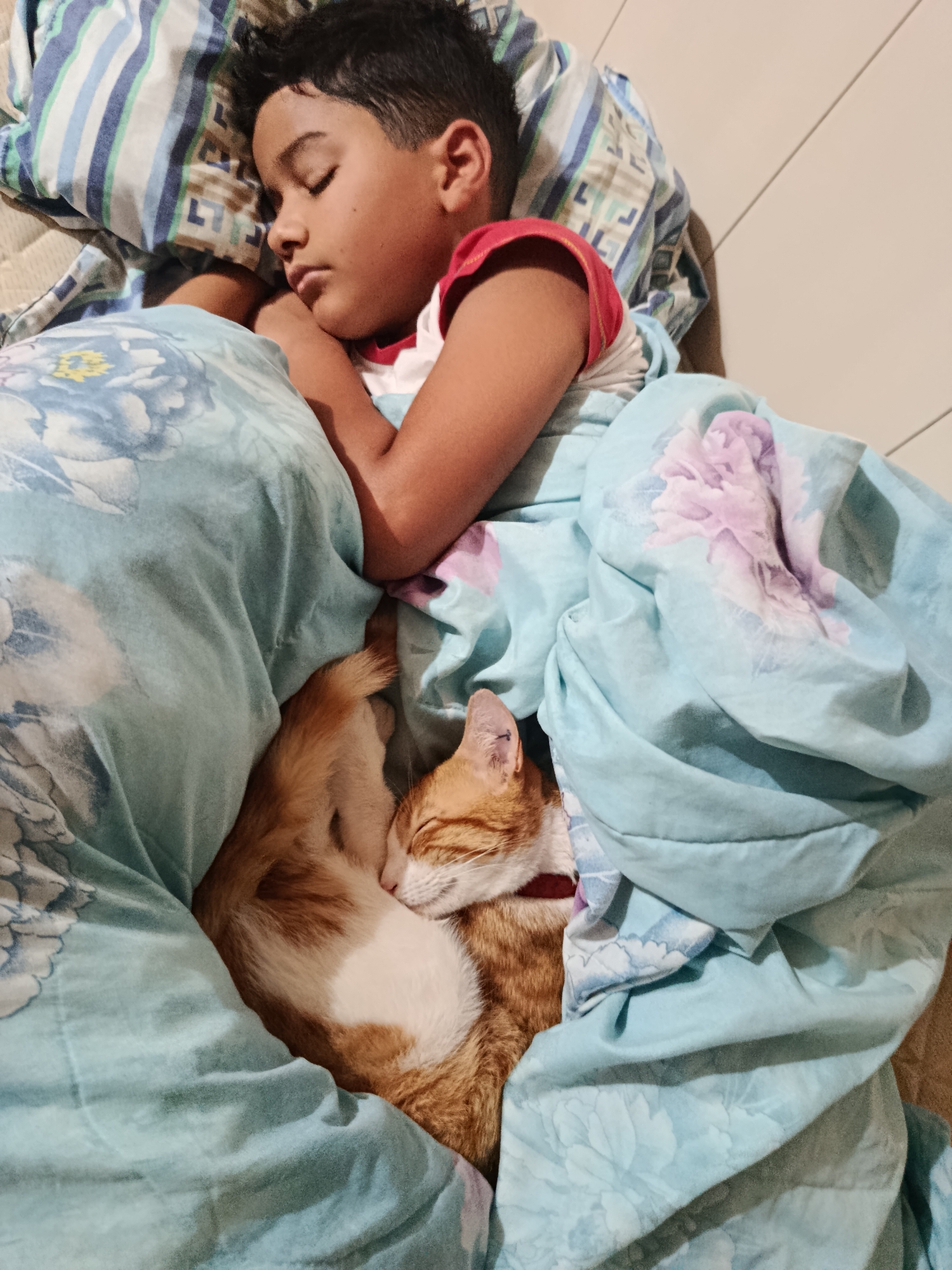 - "A young boy and an orange and white cat are sleeping under a light blue floral-patterned blanket on a bed" by FM-U9fau1, licensed under CC BY 4.0