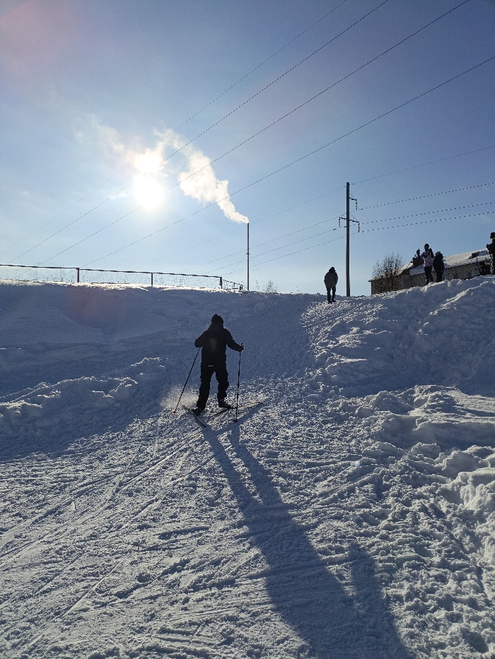 This image depicts a snow-covered landscape in Sarapul, Russia, under a clear, sunny sky. In the foreground, a lone individual in dark winter clothing is actively skiing down a pristine, snow-covered slope, facing away from the camera. They are equipped with skis and ski poles, both casting long, sharp shadows forward on the snow, indicating a low sun angle from the upper left. The snow surface shows subtle tracks and uneven terrain. In the midground, towards the right, another individual is seen ascending the snow-covered hill. Further along the crest of the hill to the far right, a small group of 2-3 figures is silhouetted against the bright sky, positioned near a building with a snow-covered roof. The background features a tall, slender industrial chimney on the left emitting a plume of white smoke/steam. Multiple dark power lines span horizontally across the upper frame, supported by a metal electrical transmission tower located in the mid-right background. A fence is visible along the crest of the initial slope on the left.