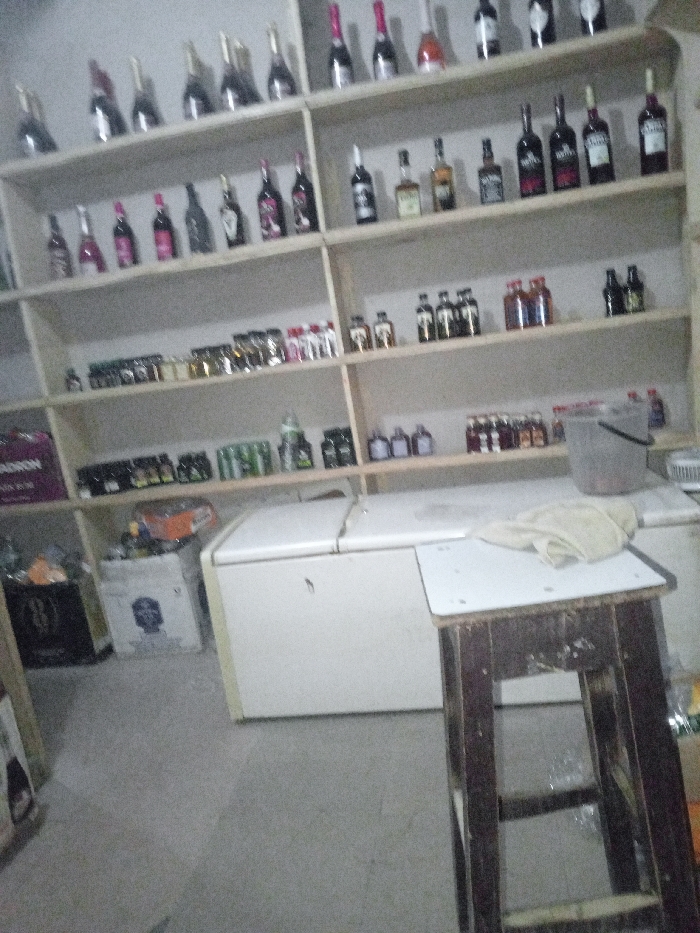 A cluttered shop with shelves stocked with liquor bottles. A white chest freezer sits below the shelves. A tall, worn wooden stool stands in front of the freezer. A bucket rests on top of the freezer, and a rag is draped on the stool. Boxes and miscellaneous items are scattered around the floor. The overall lighting is dim, creating a somewhat cluttered and disorganized appearance.