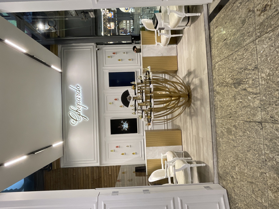 This image displays the interior of a "Ghepardo" perfume store, located within a commercial establishment in Kafr Sousa Municipality, Syria. The scene is brightly lit, showcasing a meticulously arranged retail space devoid of people. The foreground depicts a dark, mottled aggregate tile floor, transitioning to a raised, lighter-toned wood laminate or tile floor within the store's threshold. The entrance is partially framed on the left by open white bi-fold doors with paneling. Centrally positioned within the store is a large, multi-tiered gold-colored display stand, resembling an abstract tree or chandelier, heavily laden with numerous small perfume bottles. A black, folded hand fan rests on the top tier of this display. Flanking this central unit are four elegant, white-framed chairs with light-colored upholstered seats and backs, arranged in pairs on either side. The back wall features white decorative paneling with molding. Above this, an illuminated script sign displaying "Ghepardo" is prominently mounted. Below the sign, two gold-paneled counters with white marble tops are positioned on either side of the display area. The display area includes shelves with individual perfume bottles, and two large framed panels: one featuring a glowing stylized insect motif on a dark background, and another plain dark panel. A small security camera is mounted on the upper right section of the white wall. The ceiling is white and features recessed linear LED lighting fixtures. To the right, a large glass partition reflects blurred lights and shapes from an adjacent commercial area or corridor.