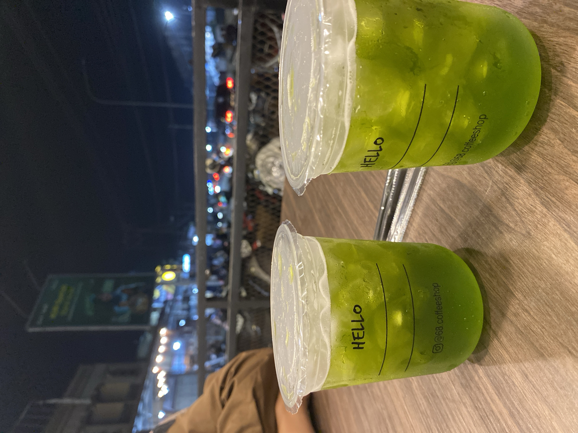 Two clear plastic cups containing a bright green iced beverage are positioned on a brown wood-grain table surface in the foreground. Each cup is labeled "HELLO" in black capital letters and features "@68.coffeeshop" at the base. Condensation is visible on the exterior of both cups, which are topped with clear, flat plastic lids. Two black straws are partially visible between the cups. A person wearing a light brown or tan long-sleeved garment is partially visible on the left side of the frame, seated at the table. The background depicts a blurred, illuminated urban night scene, observed from an elevated or patio-like vantage point, separated by a dark metal railing. Vehicle taillights (red) and headlights (white/blue) are discernible on a street, indicating traffic. Various illuminated signs, streetlights, and building lights are visible, casting a warm glow. A tall, rectangular advertising billboard with blurry green text and an image of a person is visible against the dark sky on the left. The scene is located in the city of Tanjongkapai, Indonesia, at night.
