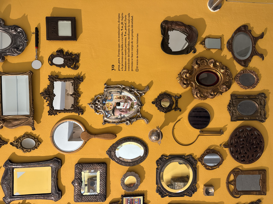 A yellow wall features a collection of ornate mirrors of varying shapes, sizes, and styles. Frames are made of silver, gold, and dark brown materials, with intricate designs. Reflections in the mirrors range from blank spaces to partial images of the room and even a person taking a photo. Above the mirrors, a text panel defines "yo," emphasizing the individual's role as the subject, the conscious part of oneself, and the start of all stories.