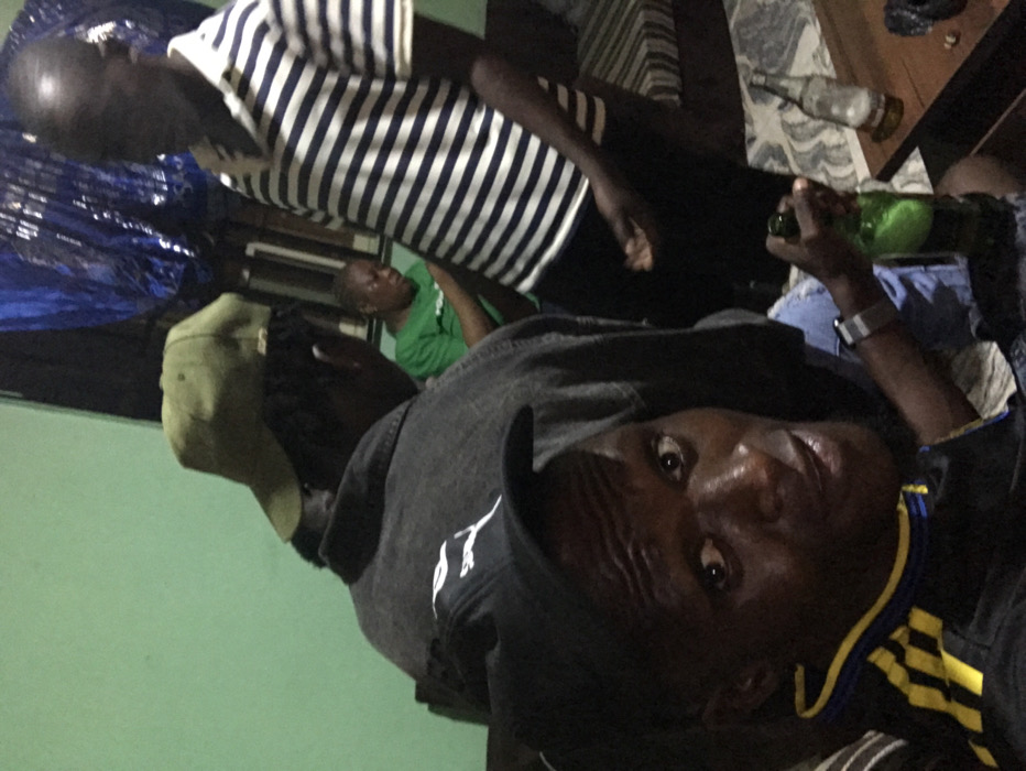 The image captures an indoor scene featuring four individuals in a dimly lit room with light green walls. In the immediate foreground, a male with dark skin, wearing a black baseball cap with a white emblem and a black shirt with yellow stripes, looks directly towards the viewer while holding an uncapped green glass bottle in his right hand. Behind him, partially visible from the back, is another male with dark skin wearing an olive green baseball cap and a dark grey jacket or shirt, which features a white Puma logo on the upper back. To the right, a standing male with dark skin wears a white and navy blue horizontal striped polo shirt; his face is obscured, and he appears to be looking downwards. In the background, a fourth individual, possibly female, is seated, wearing a green t-shirt and also looking downwards. A dark wooden table to the right holds two glass bottles, one clear and empty, the other green. Striped and patterned cushions are visible, suggesting upholstered furniture. A dark blue tarp or fabric is draped in the upper right background. There are no specific landmarks, signage, or architectural features within the image to determine a precise location within the city of Lagos, Nigeria.
