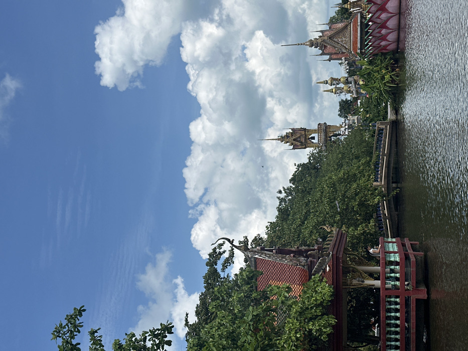 A pagoda-style building with a red tiled roof sits among trees alongside a body of water. In the distance, gold-colored pagoda structures stand taller, framed by green foliage. The sky above is bright blue with puffy white clouds. The scene appears tranquil, blending natural elements with traditional architecture. The body of water reflects some of the surrounding structures.