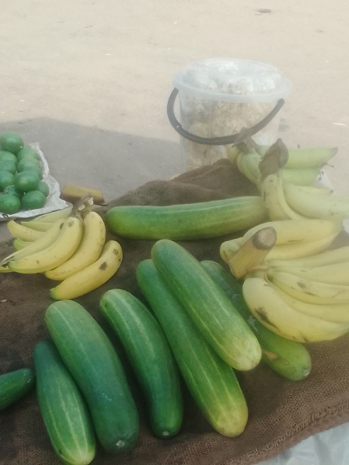 A variety of fruits and vegetables are displayed on a brown cloth. Several green cucumbers dominate the foreground, along with bunches of yellow bananas and a small pile of green limes on the left. Behind the bananas and cucumbers, a clear plastic bucket filled with small, light-colored food items is visible. The scene is brightly lit, indicating an outdoor setting.