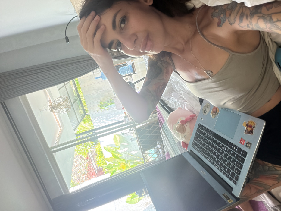 A female individual is depicted indoors, reclining on striped and white bedding, with a light blue Acer laptop resting on her lap. The laptop screen is dark, and its palm rest features multiple stickers. To the left of the laptop, a pink plush toy is visible on the bedding. The female, positioned foreground-right, has dark hair, wears a light-colored tank top and a thin necklace, and displays tattoos on both arms. Her right hand is placed on her forehead as she looks directly at the camera with a slight smile. A black gooseneck lamp is affixed to the wall behind her head. A large glass window or door separates the indoor space from an outdoor patio area, consistent with a residence in Nusa Dua, Indonesia. The outdoor environment features lush green tropical foliage, a red-tiled roof of an adjacent structure, and a concrete wall. A large blue water dispenser bottle is visible outdoors on the right. An overhead glass canopy covers part of the patio, from which a woven pendant lamp hangs. The scene is illuminated by strong natural light.