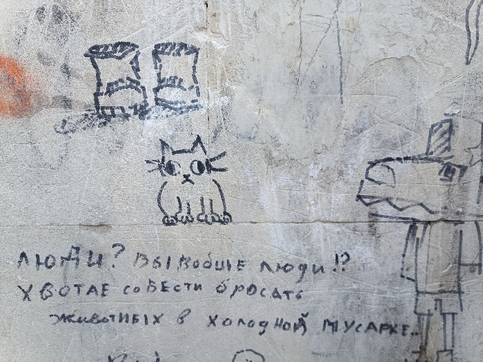 A section of a light gray, weathered wall in Sevastopol, Ukraine, exhibits multiple black line drawings and handwritten text. On the upper left, two outlined figures resembling boots are depicted. Centered below these is a stylized drawing of a wide-eyed cat. To the right, a partially visible bipedal figure, possibly a dog or monster, with pointed teeth and a head covering, is shown. Below the cat, three lines of Cyrillic text, handwritten in black, translate to: "People? Are you even people?! Have enough conscience to abandon animals in a cold dumpster..". The wall surface shows minor cracks and faded discolorations, including an orange-brown patch on the far left.
