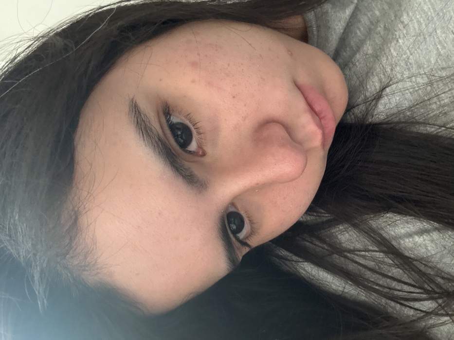 - "A close-up, high-angle portrait displays the head and upper torso of a single individual, appearing as a young adult female with fair skin, long dark hair, and dark irises" by FM-S0Unw2, licensed under CC BY 4.0