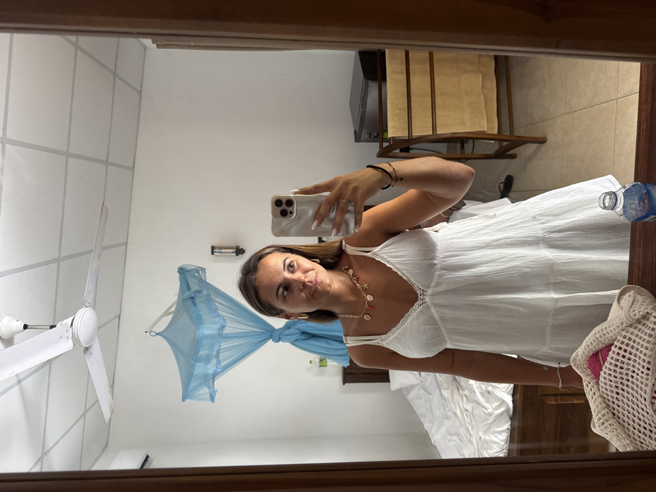 A woman in a white summer dress takes a mirror selfie in a hotel room. She wears gold jewelry and a seashell necklace. A four-poster bed draped with light blue mosquito netting sits behind her, along with a ceiling fan, a wooden chair, and a minibar. A mesh shopping bag is visible on the right of the shot. The reflection reveals a tiled ceiling and a water bottle.