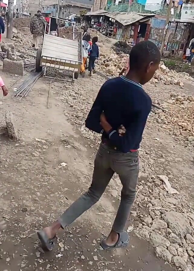 scene in what appears to be a densely populated urban area, possibly a slum or impoverished neighborhood. The ground is dirt and gravel with puddles of water. Several people, including children and adults, are present. Some are walking, others are standing. A woman carries a child on her back. A cart with a wooden frame is also visible in the scene, along with metal rods lying on the ground. Laundry is hanging from lines between buildings, indicating residential life in the area.