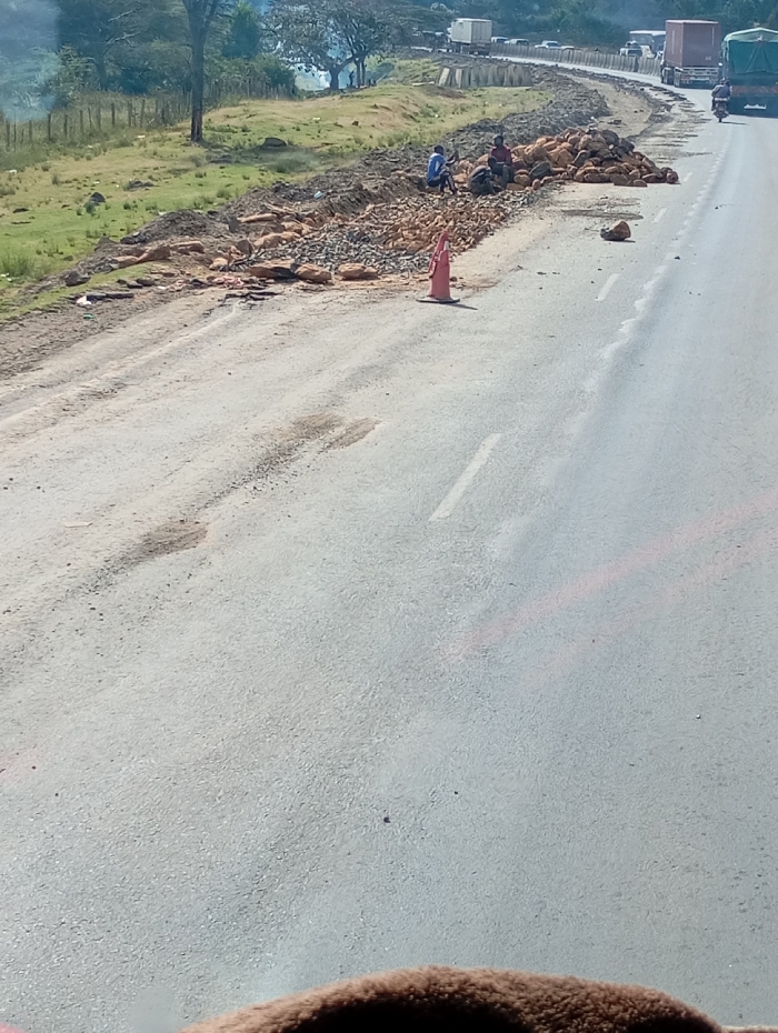 The scene depicts a section of a paved roadway in Molo ward, Kenya, with an adjacent disturbed embankment. The road surface is grey asphalt, featuring a solid white line on its right edge and faint, reddish linear markings on its right half. An orange traffic cone is positioned upright on the left shoulder. Immediately to the left of the paved surface is an unpaved embankment composed of dirt, gravel, and numerous irregular, reddish-brown rocks, which are piled in sections. Three individuals are present on this embankment near the rock piles; one wears a blue shirt and is seated, while two others in dark clothing are also in close proximity to the rocks, their specific actions unclear. Beyond the embankment to the left, a grassy slope with sparse trees and a fence line is visible, with a plume of smoke or dust rising from the background. In the distance on the roadway to the right, a line of heavy goods vehicles, including one with a green tarp, and a motorcycle are observed, indicating active traffic.