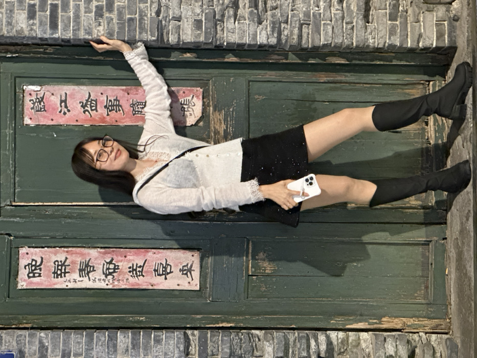 An East Asian female subject stands in front of a weathered, dark green double wooden door in Shangcheng District, China