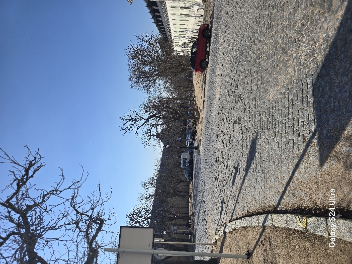 The image presents an outdoor scene in Real Sitio de San Ildefonso, Spain, under a clear, bright blue sky. A wide, grey cobblestone road, composed of interlocking rectangular pavers, curves from the lower left quadrant towards the right background. On the immediate left, a narrow strip of dry, light brown ground runs parallel to a stone curb that separates it from the cobblestone surface. Long, dark shadows, indicative of a low sun angle, stretch across this ground and a significant portion of the cobblestone road. A light-colored, vertical pole is visible in the left foreground. In the midground, a multi-story building with a light-colored facade, numerous windows, and a dark, multi-pitched roof line the right side of the cobblestone road. A red SUV is parked parallel to this building on the cobblestones. Further into the background, a cluster of deciduous trees, predominantly bare of leaves, defines a central area. Beyond these trees, additional parked vehicles, including a white van, are visible on another road or parking surface. A building featuring a dark, dome-like structure can be faintly discerned among the trees in the central background. No individuals are present in the depicted scene. The bottom left corner of the image contains a "Galaxy S24 Ultra" watermark.