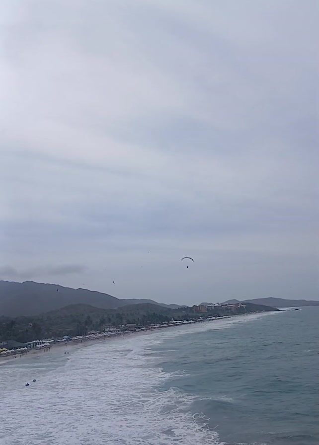 beach on a cloudy day, with mountains in the distance and a parasailer floating above the water. The beach is populated with people, and there are several buildings along the shoreline. The ocean is a light blue color and has white waves. The camera is static, providing a wide shot of the scene.