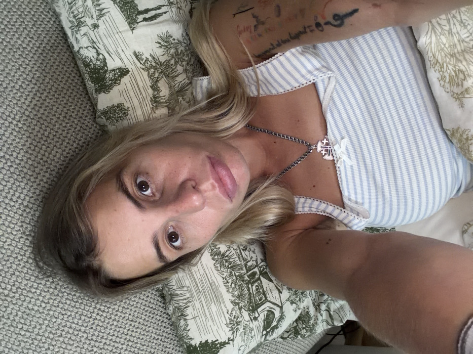 A blonde female, estimated to be between 25 and 35 years old, is depicted in a close-up selfie, lying down on her back